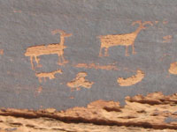 I would rate this trail as moderately difficult. It’s easy at first as it follows the streambed, but the walking gets serious when the strenuous climb out of the canyon bottom begins. Don’t get sidetracked with a well-used trail to the right - that quickly dead-ends in a box canyon. Be prepared for the boost up on a pile of loose rocks to the ledge above, about half way up the trail, although it is possible by scouting around to find an easier route. Heavy exertion is required to scramble up the remainder of the twisty trail to the last tricky section - a slab of slanted slickrock where boots with good vibram make a big difference. It’s difficult to get traction on this portion of angled rock; if all else fails, you can knee and crawl up the last few feet. Once you’ve accomplished that, you’ve accessed the final level of the canyon, where a large panel of bighorn sheep pops into view. Now I take a deep breath and stroll over for a close look at these petroglyphs. The big mystery to me is how could those etchings have possibly gotten so high up on the brown varnish? A piece of the puzzle is obviously missing! My personal assumption is an ancient ledge that supported those prehistoric artists has long since slid away.