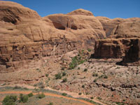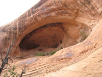 After passing a cavernous alcove high on the cliff wall, the trail splits – left is the route taken by the base jumpers, right goes over a rock incline to the overlook of Pritchett Canyon. I choose right, knowing that further along, I will be forced to make another choice - stay on the fin to the right or go left into the wash. Both routes are marked with cairns and either has its rewards. The high route leads to lofty wide-open views; the low route provides the intrigue and shelter of rock walls. In the summer I opt for the shade of the low route.