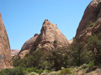 Base jumpers travel on this trail between the fins for their ascent of Tombstone Dome where they make their jump, a feat I have witnessed several times. So before you start your walk, look up. If you see someone on the dome above the road an extreme event just might happen. Watching a person in freefall does make my heart rate go up a bit. That loud snap, sounding like the firing of a shotgun when the parachute snaps open, commands instant respect. Landings usually happen on the road, but some even manage to zoom in next to a parked car.