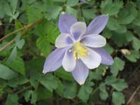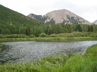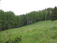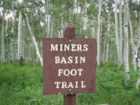 This steady uphill trail with its lovely bouquet of blue columbines, red columbines and bluebells clings next to the stream as it wanders past the sloping jumble of loose rock called scree. I easily tiptoe across the only stream crossing and when the firs and spruce give way to an aspen lined meadow, I am at a signed junction - right for the Mountain View Trail, left for the Miners Basin Trail. I go right to walk about a mile to the end of the trail.