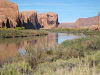 Following Kane Creek to its confluence with the Colorado River, the pathway wanders through a riparian zone of tamarisk, lacy filamented grass, willows and huge cottonwood trees with leaves that glow yellow in the late fall sunshine. Edged by sagebrush, saltbush, rabbitbrush and greasewood, this is a good place to see the birds: chickadees, song sparrows, spotted towhees, scrub jays, juncos and white-crowned sparrows flock to this choice location.