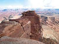 Island In The Sky, with an average elevation of 6100 feet, is the park’s highest district. Aptly named, this “desert island” is a sheer-walled plateau that towers more than a thousand feet above its surroundings. From this vantage point a tangled web of canyons, mesas, buttes, fins and spires can be seen for miles and miles – a wondrous horizon-to-horizon view climaxed by three distinct mountain ranges – the La Sals to the east, the Abajos to the south and the Henries to the west.