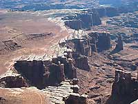 Located 1200 feet below the Island In The Sky mesa, the White Rim is the top layer of the Cutler Formation, a wide bench of sandstone deposited 225 million years ago. In the 1950s uranium prospectors constructed a road along its edge to access the ore. Mining, however, requires a lot of water, and thus an extension of the Lathrop Trail, was built down to the Colorado River - a lot of work for a mining boom that barely lasted a decade. Today the miners are gone, but the White Rim Road still lives on as a popular mountain biking and 4X4 route almost 100 miles long.