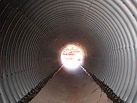 On this refreshingly cool morning, I am savoring my early bird, beat-the-crowd start. Not a soul is stirring as I climb up to the culvert and enter its cavernous interior under the railroad tracks for an eerie walk to the light-at-the-end-of-the tunnel experience.