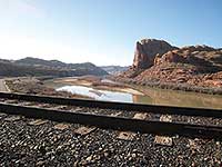 The drainage ends at the railroad tracks, where sweeping vistas of the Colorado River and its accompanying canyons put in a brief appearance. But very quickly a switchback - the only one on the entire trail – swings sharply upward toward the bench above Culvert Canyon. Once on top the tricky part begins as I keep searching for the stacked rocks called cairns that mark the route. Placed far apart over a long swath of gray slickrock, they are difficult to see, and it takes a fair bit of scouting to stay on course. By trial-and-error I learn not to stray too far from the rim, a strategy that has the added advantage of catching enchanting glimpses of the cottonwoods and mysterious pools deep within the canyon.