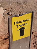 A short climb brings me to a sign for a loop to view the dino tracks. First though to come into sight are some outstanding panels of petroglyphs that have lasted for thousands of years. Now I’m glued to the fascinating depictions of human figures holding hands, a faded circle, lots of squiggles, strange, oddly shaped animals, and bighorn sheep – one of them with a head on the front and the rear.