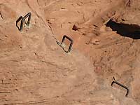 Continuing upward on the main trail the painted turquoise dashes on the slickrock direct me to a narrow slot. And then I’m gasping at what I see – a steep wall with a series of metal handholds. Without them, I would never attempt this. Even with them, especially by myself, it is questionable! For a hard-core hiker, this is business as usual, but for the more casual hiker like me, this is way out of my league. I, however, have come this far; I’m not turning back now. So with much trepidation I grab the first one, but I can’t reach the next, which forces me to boost myself up with my feet until I can grasp it.