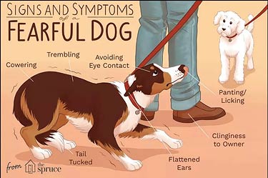 Fear is a normal emotional response in dogs that can be from a real or perceived threat writes Dr. Christine Calder, DVM, DACVB. Some dogs respond with subtle behaviors that seem shy, approaching with their head carried low, ears to the side or held flat, brow furrowed with a worried look, and eyes closed or blinking. Their mouth may seem tight, or they are licking their lips or yawning. Their tail may be lowered and slowly wagging.