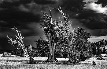 | A picture of ancient bristlecone pines was originally made on color film with a 4x5 inch view camera, then converted to a digital file. By tweaking contrast and opening shadows a dramatic b&w image was created. |