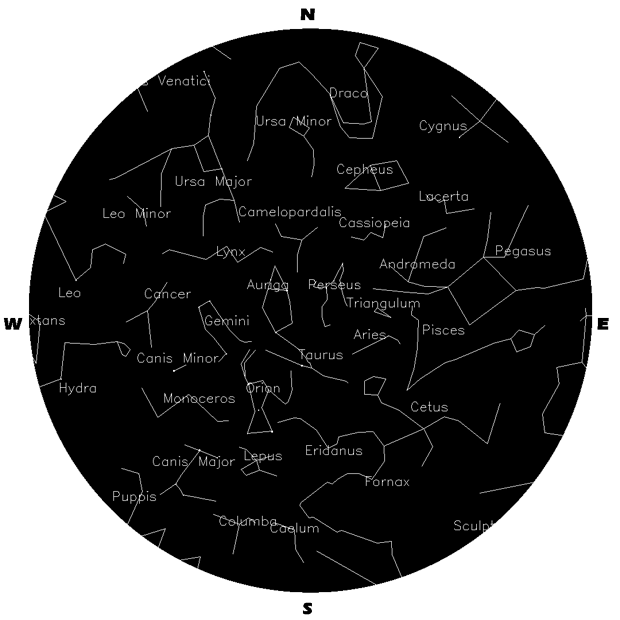Hold the star chart high above your head and match the compass directions to the direction you are facing. Adjust the star chart by orienting Ursa Major (Big Dipper) to match its position in the sky.