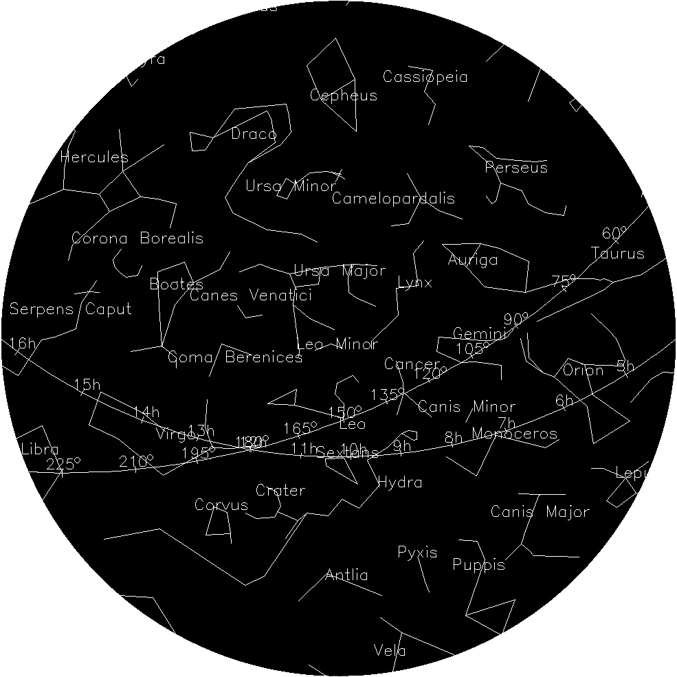 The star chart approximates the sky from astronomical twilight to midnight. As the night and month progresses, the constellations shift toward the northwest. The celestial equator is measured in hours (h).