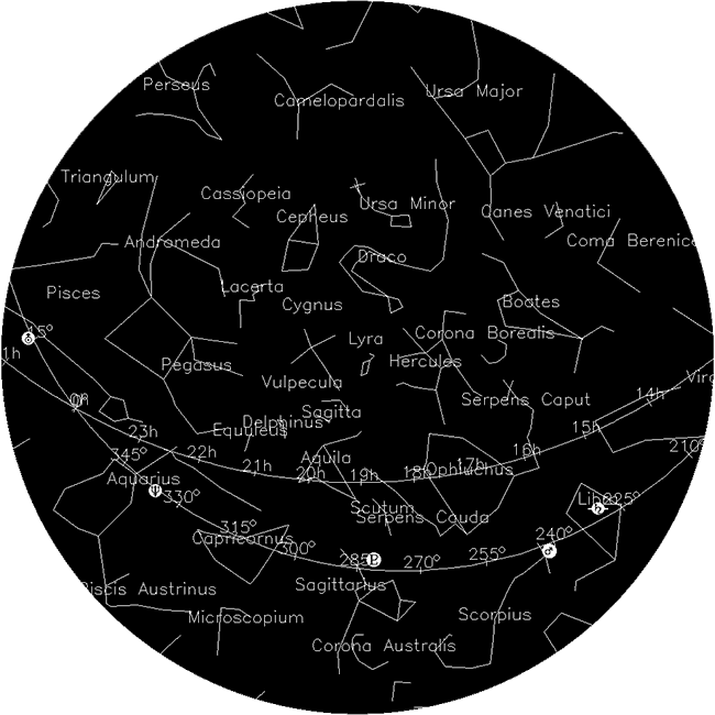 Summer relinquishes its hold on the northern hemisphere at 8:29pm, September 22. At that moment the sun’s apparent pathway across the sky passes the equator and moves into the southern hemisphere. In celestial terms, the autumnal equinox marks the moment when the ecliptic crosses the celestial equator. This point is in Virgo. The autumnal equinox provides good conditions for viewing the zodiacal light. Look for a white cone of light due east above the horizon about one-half hour before astronomical twilight brightens the morning sky. The zodiacal light is caused by beams of light shooting straight up from the sun (through dust motes circling within the solar system) before it crests the horizon.