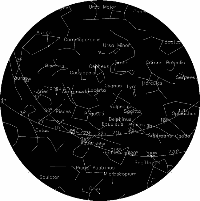 The star chart approximates the sky from astronomical twilight to midnight. As the night and month progresses, the constellations shift toward the northwest. The celestial equator is measured in hours (h).