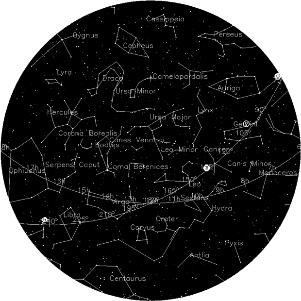 The Milky Way is absent from the night sky until well beyond midnight for most of the month. The dominant stars in the overhead sky—Arcturus (Boötes), Spica (Virgo), and Regulus (Leo)—form an acute isosceles triangle with Jupiter (Cancer) outshining them on their western flank and evermore brilliant Venus near the western horizon. On the eastern horizon, Vega (Lyra) rises in the northeastern sky and Saturn (Libra) in the southeastern sky.