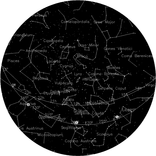On September 23 at 2:21am MDT the sun’s apparent pathway across the sky (the ecliptic) crosses the celestial equator. Anyone standing on the Greenwich Mean Line (aka 0 ̊ longitude) will see the sun in the eastern sky at 8:21am GMT. If the sun were eclipsed at that moment, s/he would see the constellation Virgo behind it. The September star chart shows where the ecliptic crosses the equator in Pisces. This marks the sun’s position at the Spring equinox. The zodiacal light is visible in the morning pre-dawn sky for about one month before and after the equinox. About one-half hour before astronomical twilight begins, look for a white cone of light due east above the horizon. The zodiacal light is created when sunbeams directed straight up from the horizon illuminate dust motes circulating within the inner solar system. The cone of light extends as high as 65 ̊ above a level horizon.