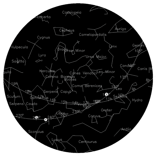 The band of stardust and gas we call the Milky Way is absent from the May sky until after midnight when it swings down from the north into the eastern sky. We look edge-on through the plane of our galaxy, but right now the plane of the Milky Way is lined up with the plane of the Earth’s horizon. If you think of the galactic plane as the galactic equator, then there is a galactic north pole and south pole. Find the galactic north pole by looking for Coma Berenices directly overhead. Look for three faint stars that form a corner—between Arcturus and Leo—and you will be looking beyond our galaxy, although the stars you see are within the Milky Way. Thousands of galaxies—not visible with the naked eye—loom beyond.