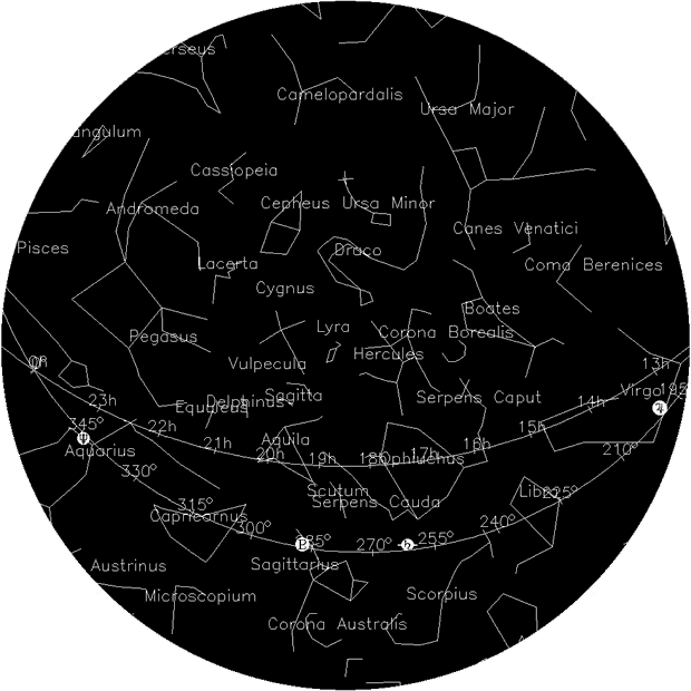 The star chart approximates the sky from astronomical twilight to midnight. As the night and month progresses, the constellations shift toward the northwest. The celestial equator is measured in hours (h).