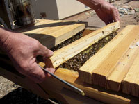 The queen is inside of a plastic mesh tube. Worker bees cling to the tube trying to get in to attend to her. As Robin Straub lifts the new queen and her entourage out of the shipping box, I'm struck by how much it looks like a large pine cone. Robin places the queen with the tube open into the new hive box. Then she rather unceremoniously dumps the three pounds of workers into the hive. She has prepared the hive box with sugar water and new frames. The sugar water tides the bees over until they can get out foraging for nectar (carbohydrates) and pollen (protein). Frames give the bees a structure on which to build their comb.