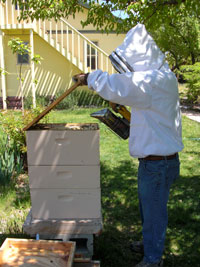 This was the installation of one of several hives being started in Moab this spring. Jerry Shue, Moab's local bee expert and a former bee inspector from Pennsylvania, is on hand in case the bee keepers need help. Everything goes smoothly for Robin and her new bees. Several other prospective bee keepers are watching and learning about establishing a hive. Some will buy bees while others say they will wait for an older hive to divide and swarm.