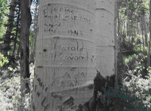 Years before the Manti-La Sal National Forest’s current push to sign and maintain all of these trails, a gentleman named Harold Provonsha roamed the region tending to sheep. Born in 1924, Harold started tending sheep, by himself, at the age of 11 and he continued until 1943. Harold’s mother, Isabelle, would take him supplies on the mountain. His parents kept him out of school during the fall and spring to work in the mountains. Isabelle would take his homework to him every week, and return the assignments to his teachers as he completed them. Harold would write notes on Aspen trees with his name and date, an almost daily occurrence in the early forties, so that his mother would know where he was. When she brought supplies, Harold would run straight for the panniers and find the canned milk. Hundreds of inscriptions remain from Hell Canyon through La Sal Pass to Pole Canyon in what was once known as the “Moores Range.” During the early years of WWII, Harold’s dad obtained a deferral for him from the draft, but when he turned 19, Harold thought he needed to serve his country. He went to the draft board and enlisted in the Navy. An excerpt from an Aspenglygh before he enlisted and after he was in the Navy reads as follows: