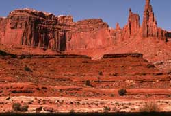 The White Rim Trail follows a 4 wheel drive road that begins or ends on the Shafer Trail or Mineral Bottom roads that each drop steeply off the island plateau before leveling off to the White Rim bench layer of sandstone aptly named “White Rim” for this very locale. Along the route are campsites with pit toilets and nothing else except spectacular views in every direction and endless exploring to do by foot.