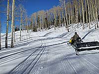 LUNA (Lower Utah Nordic Alliance) is a group of dedicated volunteers who work with the Manti-La Sal Forest Service to provide a groomed Nordic track system starting from the Geyser Pass Trailhead. Beginning in mid-December or whenever the snowpack is established, LUNA volunteers use a system of 2 snowmobiles pulling grooming equipment to lay a Nordic track wide enough for skate skiing and with a set of parallel tracks on the side for classic skiers.