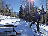 Gold Basin is an intermediate track and is reached by continuing up the main Geyser Pass Road track from the Meadow Loop to the intersection with the Gold Basin Road, which branches right. The Gold Basin Track is rolling, both out and returning, and offers a peaceful ski through pines and aspens with occasional views of the red rock desert below. You may see backcountry skiers accessing many of the popular runs above the track or returning from turns in the powder. The Gold Basin Track ends at the point where motorized travel is prohibited from going further, thus making this an out and back excursion totaling 8 km (5 miles) round trip from the trailhead.