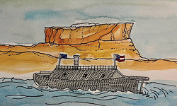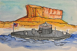 The battle was fought under clear skies after overnight thunderstorms over March 8 and 9, 1862, part of the Confederates’ effort to break the Union blockade that had cut off Norfolk and Richmond from international shipping. Many years later, someone noticed that a couple of isolated flat-topped sandstone rock formations in Grand County, Utah, had a striking resemblance to the ironclad battleships Monitor and Merrimac involved in that battle. On a recent cool, gusty afternoon with blue skies streaked with flimsy shawls of cirrus clouds, I ventured north to take a look at those Estrada sandstone counterparts: the larger Merrimac Butte covers 2,000 to 6,000 feet in width and is 1,600 feet long, while the smaller Monitor Butte is shaped much like the rotating turret (or “Yankee cheese box”) of Merrimac’s Union attacker.