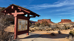 To get to this trailhead, I drove north out of Moab up US 191 for about 11 miles, then turned left/west onto State Route 313. After crossing the railroad tracks, I gawked at astounding hoodoos, balanced rocks, and swollen pillows of slickrock as I climbed up through the geologic layer cake of Sevenmile Canyon. After about four miles, I saw a View Area sign, then the Monitor and Merrimac Butte Viewpoint turnoff on the right/north side. The parking area has a toilet and an information kiosk accessed by a paved walkway. A more primitive “strolling trail” loop then begins along a path defined by logs in the sandy areas and dashes of olive-green paint in the slickrock sections. I walked to the north end of the lollipop that skirts the edge of a desert mesa and looked down into a rubbly wash and across to the stately buttes. This trail has little shade and no water except for what you bring yourself. It is also rattlesnake territory, so be on the lookout. Juniper and pinyon trees offer framing for photographs of the buttes, bathed in especially dramatic golds, salmons, and corals in the late afternoon. Other vegetation along this overlook includes singleleaf ash (Fraxinus anomala), Mormon tea (Ephedra viridis), and thorny blackbrush scrub (Cologne ramosissima), plus various grasses. A snack stop of limeade, crackers, and guacamole (avocados are in season) settled my soul as I sat in welcome solitude amid the desert quiet, contemplating explosive conflicts of long ago.